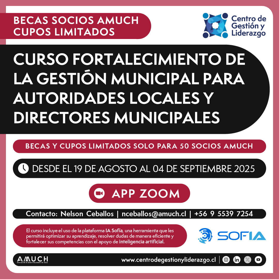 La Asociación de Municipalidades de Chile (AMUCH) es una organización que reúne a municipios del país con una visión moderna y eficiente de la gestión local. Su misión es fortalecer el rol de los gobiernos comunales, promoviendo la innovación, el liderazgo y la colaboración entre alcaldes y equipos técnicos para mejorar la calidad de vida de los ciudadanos.